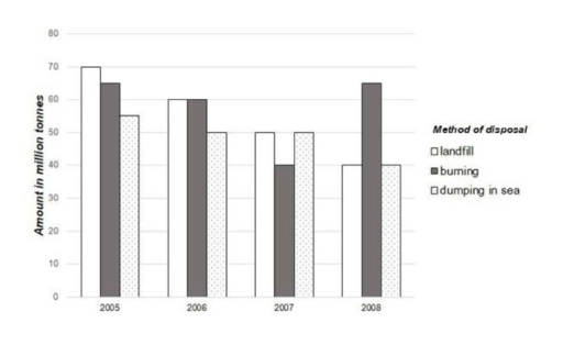 Task 1: The chart below shows different methods of waste disposal in a European country from 2005 to 2008 Summarise the information by selecting and reporting the main features and make comparision where relevant.