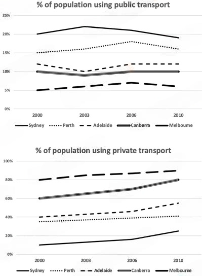 Task 1: The line graphs show the percentage of people using public transport and people using private cars in five cities of Australia from 2000 to 2010. Summarise the information by selecting and reporting the main features, and make comparisons where relevant.