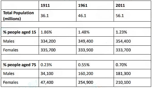 Task 1: The table below shows the total population and the proportion of males and females aged 15 and aged 75 in the UK from 1911 to 2011. Summarize the information by selecting and reporting the main features, and make comparisons where relevant.