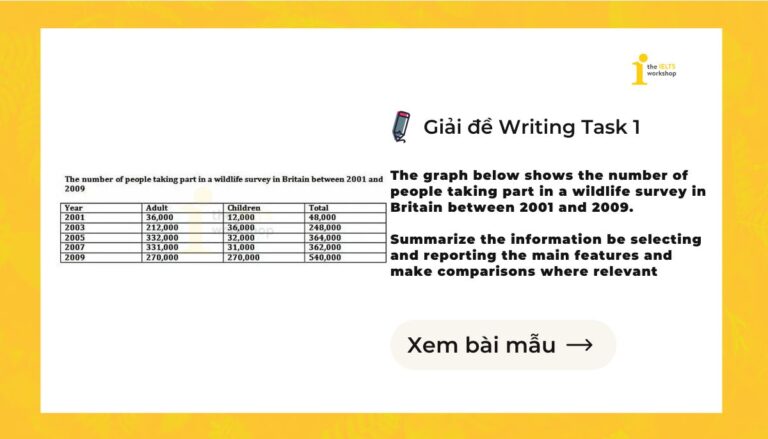 Dưới sự hướng dẫn của cô Nguyễn Mai Linh, bài mẫu chủ đề the number of people taking part in a wildlife survey in Britain between 2001 and 2009 được sẽ giúp người học hiểu rõ cách xây dựng và hoàn thiện một bài IELTS Writing Task 1 chuẩn chỉnh.