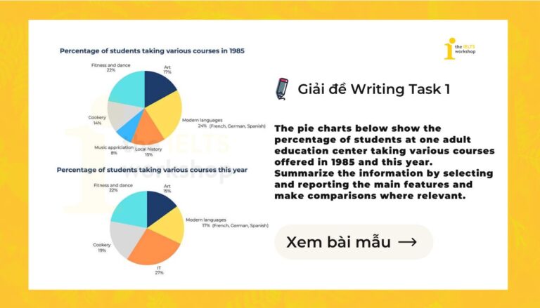 Với sự hướng dẫn của thầy Nguyễn Sơn Tùng, bài mẫu chủ đề the pie charts below show the percentage of students at one adult education center taking various courses offered in 1985 and this year sẽ giúp người học hiểu rõ hơn cách triển khai và hoàn thiện một bài IELTS Writing Task 1 đúng cấu trúc.